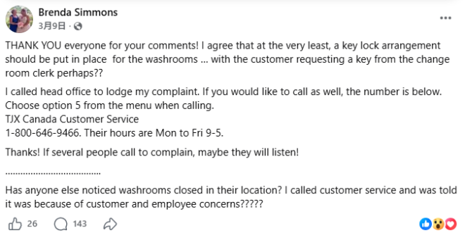 Fraser 并不是唯一感到不满的顾客。一些消费者表示,由 TJX Companies 旗下的 Winners、HomeSense 和 Marshalls,近期在加拿大部分门店关闭了洗手间。在社交媒体上,包括渥太华、蒙特利尔、多伦多、Thunder Bay 以及 Dartmouth 在内的多个城市都有顾客反映,当地门店已无法使用洗手间。