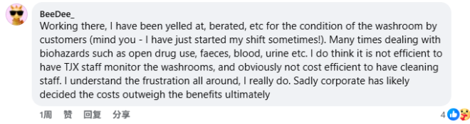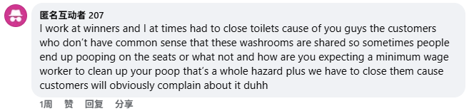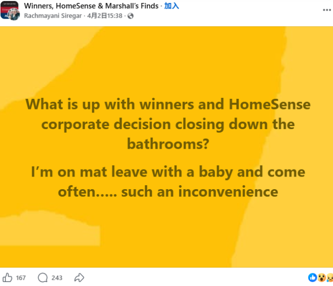 甚至在 2024 年,就有顾客在 Winners Canada 的 Facebook 页面反映,卑诗省 Burnaby 一家门店的洗手间直接被封了起来。“店员告诉我……为了员工和顾客的健康与安全,洗手间永久关闭。这一点完全没有提前说明,”该顾客写道。