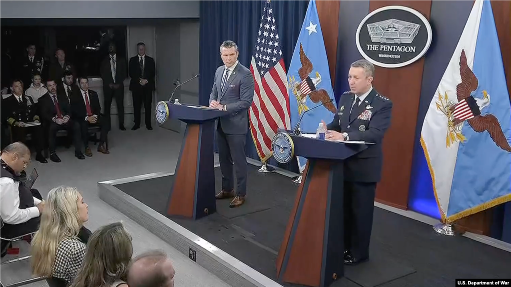 2026年4月16日,美国战争部长海格塞斯和参谋长联席会议主席凯恩将军在五角大楼举行记者会。