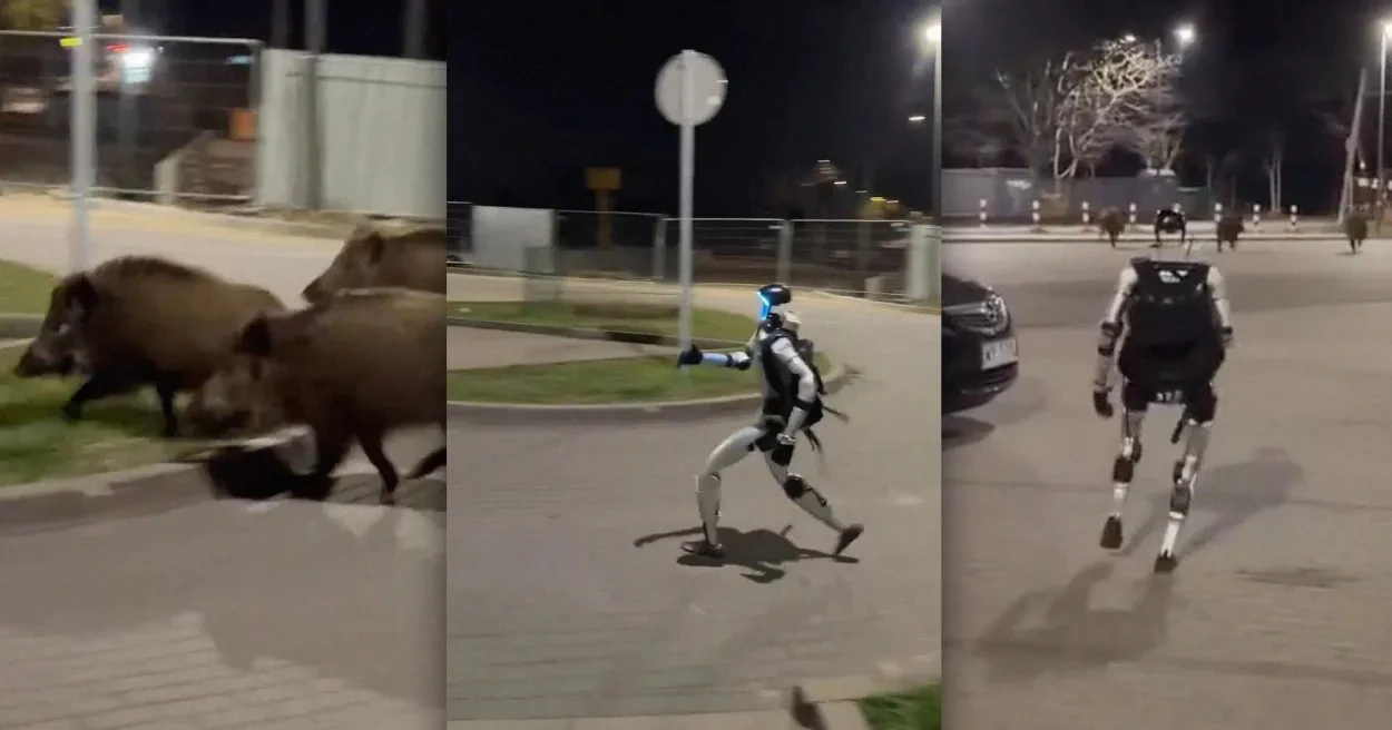 一台中国制的机器人“Unitree G1”在波兰华沙的街头追逐著一群野猪。(截图自X@edwardwarchocki)