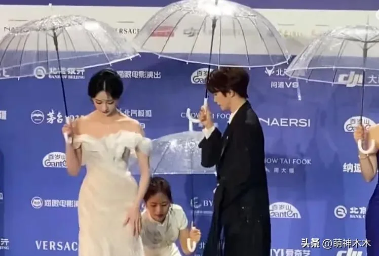 电影《偷偷藏不住》剧组出场的时候,雨已经下得很大了,女主朱珞宁的裙摆在湿地上一直拖到背景板前,还得麻烦礼仪帮忙整理。