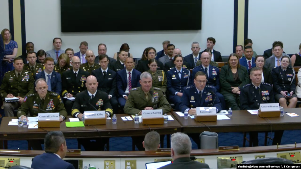 来自美国陆军、海军、空军、海军陆战队和太空军的高级军官在美国众议院军事委员会战备小组委员举行的一场听证会上作证。(2026年4月15日)