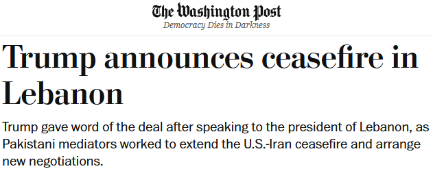 总统川普周四宣布黎巴嫩停火。川普在一则社交媒体帖子中表示,黎巴嫩与以色列“已达成一致,为了实现两国之间的和平,他们将正式开始为期10天的停火”。