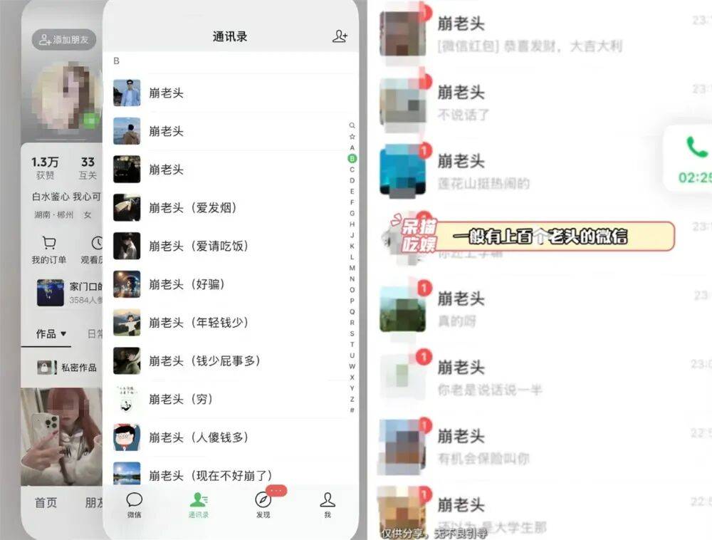有人晒出自己的聊天记录,消息99+,全是备注“崩老头”发来的消息。
