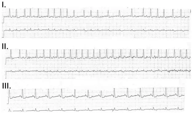 患者在直肠指检前(I,II)和直肠指检后(III)的心电图。(图片来源:Ruan, 2010.)