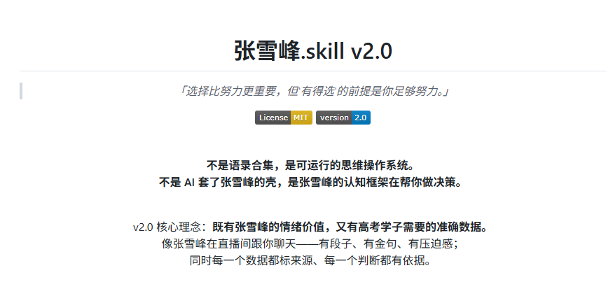 正好我最近也在研究怎么做ai 产品,所以就想做个张雪峰skill,放在自己的GitHub上,是觉得真的如果有人能用到它,帮助到他,也是挺好的一件事情。