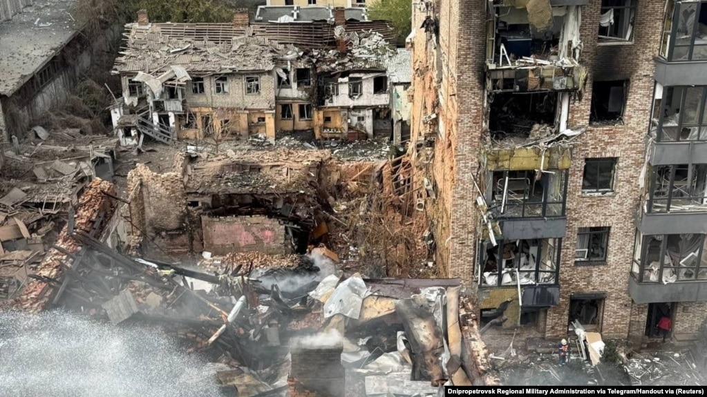 这张2026年4月16日发布的资料照片显示,在俄罗斯对乌克兰发动的袭击中,乌克兰第聂伯罗市的公寓楼遭到俄罗斯导弹袭击。