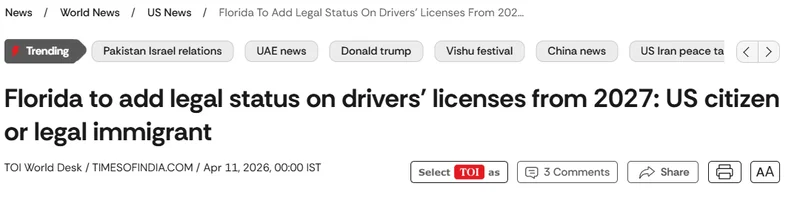 媒体报道称,佛罗里达州将从2027年起,在符合REAL ID标准的驾照和身份证上标注持有人的法律身份信息。