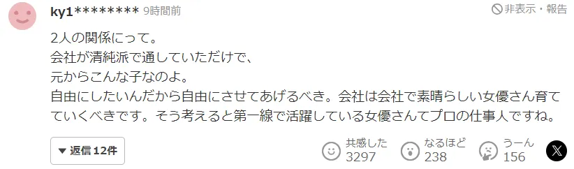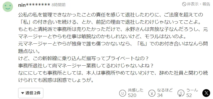 嘴上说是因为“没能管好私生活”才引咎辞职的,结果转头就突破了禁忌,继续维持着这段“私”人关系。这不就说明,当初退社根本不是因为这个理由吗?说白了,“清纯”本来就是事务所单方面想卖的人设,永野芽郁本人可能就是个奔放的主儿。至于那个所谓的“前经纪人”,业务能力或许是一流的,但道德感确实欠奉。如果那个前经纪人是单身,且没伤害到任何人,那他们在“私”底下的交往本身倒也没什么问题。