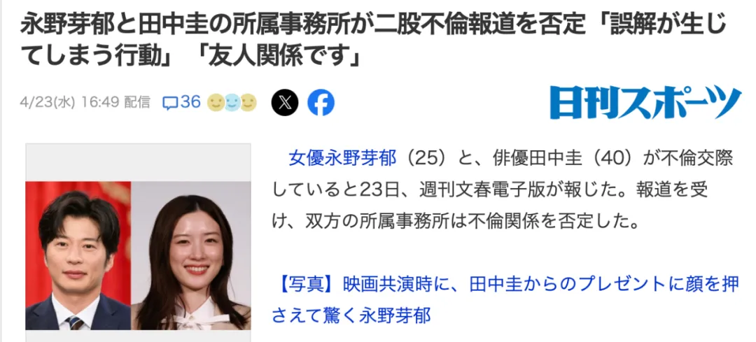 但谁能想到,人家A先生离职不离岗,两人之后仍然联系频繁,永野芽郁有事也是第一时间找A先生商量,去年10月还被拍到两人一同去看了演唱会。