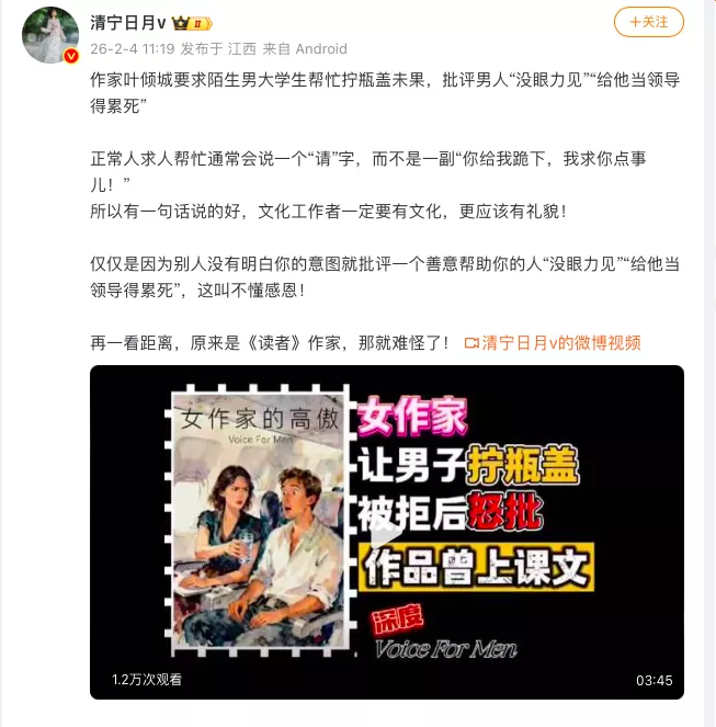 叶倾城在热搜上翻车了。她的翻车,不仅是拧瓶盖的沟通问题,更是她所擅长的那种居高临下、充满预设的人生导师姿态,在一个人人强调平等、厌恶说教、警惕爹味、妈味的时代,遭遇的必然反噬。