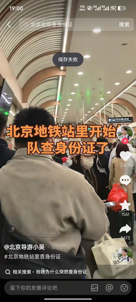 据网传视频消息,近日北京地铁开始严查身份证,目前尚不清楚开始严查的原因。视频画面中,乘客在地铁站里大排长龙等待检查,警察林立。一名女士无奈地说:“北京地铁站里又开始查身份证了,又开始排队”。