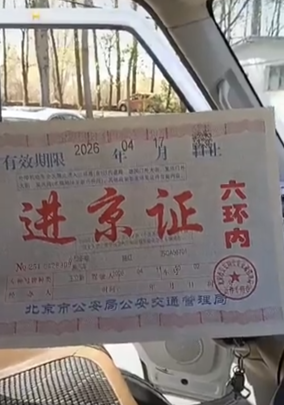 4月15日,有网传视频中,一名司机手持一张北京市公安局公安交通管理局颁发的“进京证”,签发日期是2026年4月11日,有效期限到2026年4月17日。该司机说:“这进京证是办好了,还是六环外的,这五环、四环、三环、二环你就别想了,就这…都关关……”