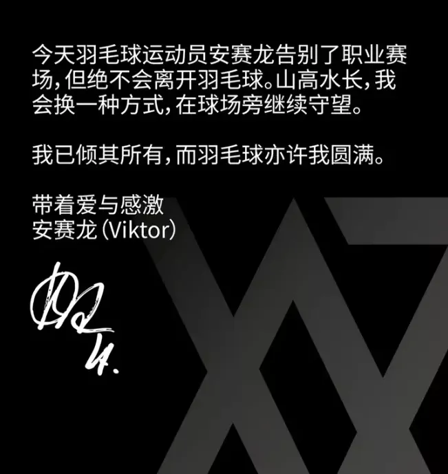 昨天,也就是2026年4月15日,32岁的丹麦羽毛球名将、两届奥运会金牌得主,安赛龙,在社交媒体上发布了退役声明:“我已倾其所有,而羽毛球亦许我圆满。”