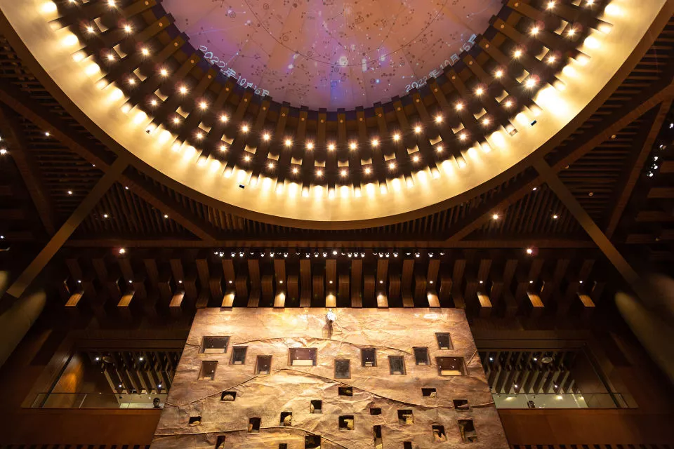 中国考古博物馆展馆中央大厅,考古墙壁和穹顶上方为中国东方天文星宿图,该星图里包括三垣四象二十八星宿,展示了古代天文学中的星空图景和星座分布。(视觉中国图)