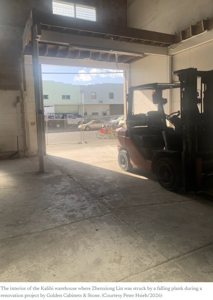 2024年8月3日,也就是他刚刚到美国十几天的时候,在一处仓库装修工地上,事故发生了。一名叉车司机在操作时撞到了仓库的支撑柱,一块约12.5英尺长、重达50磅的木板随之脱落。