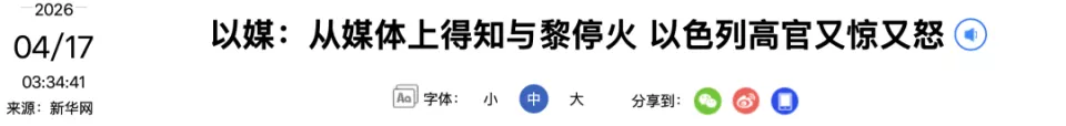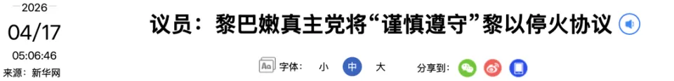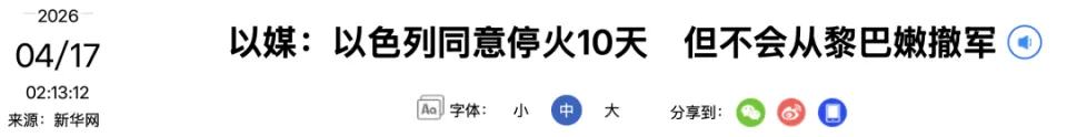 据多家以色列媒体16日报道,在美国总统特朗普提出请求后,以色列已同意与黎巴嫩真主党进行为期10天的停火,但不会从黎巴嫩南部撤军。