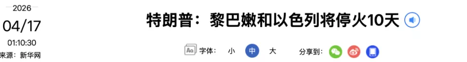 稍早时候,美国总统特朗普在社交媒体发文,宣布黎以将于美国东部时间当天17时(黎以当地时间17日零时)正式开始停火,为期10天。