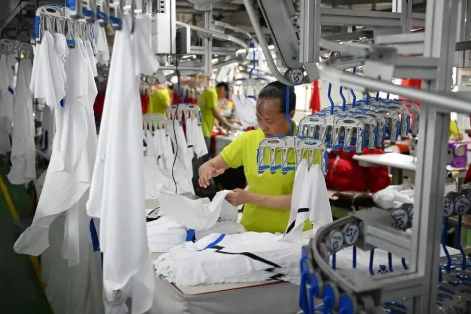 晋江卡尔美体育用品有限公司服装生产车间,工人在赶制订单/新华社记者周义摄