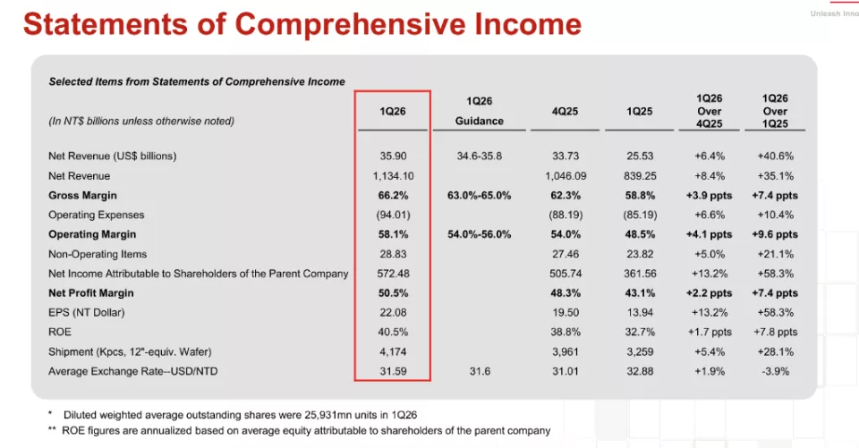 台积电16日公布2026年第一季度财报,净利润达5725亿元新台币,同比增长58%,较预估的5424亿元新台币高出约6%;营收为1.134万亿元新台币,同比增长35%,高于预估的1.12万亿元新台币;营业利润为6590亿元新台币,亦超出预估的6238亿元新台币。
