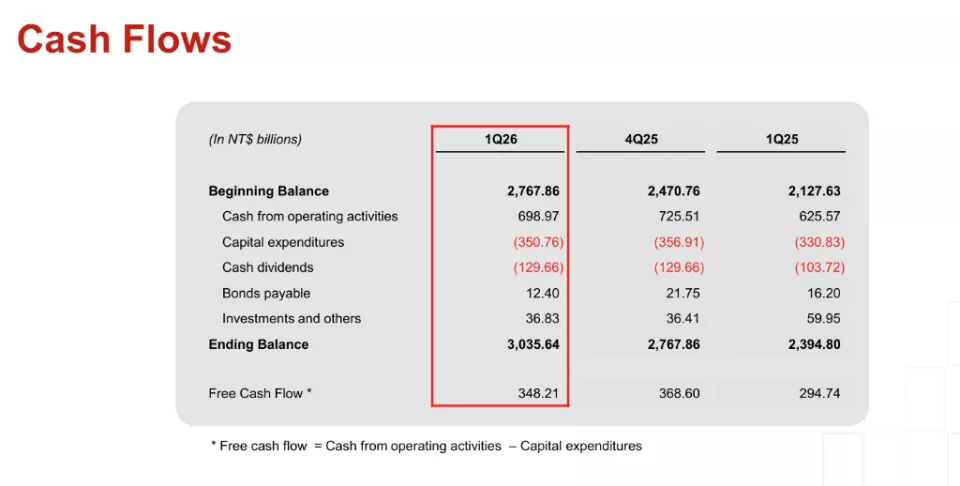 现金流方面,本季度经营活动现金流入698.97亿新台币,资本支出为350.76亿新台币,自由现金流录得348.21亿新台币,同比增长18.1%。现金股利支付129.66亿新台币,期末现金余额(不含有价证券)为3035.64亿新台币。董事会已批准2025年第四季度每股新台币6.00元现金股利,拟定于2026年7月9日派发,持续回馈股东。