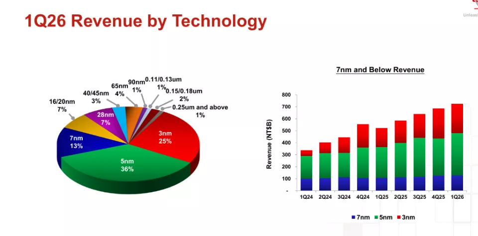 7纳米制程本季度占比为13%,16/20纳米及28纳米制程分别占7%,成熟制程(0.15/0.18微米)占4%,其余节点合计占比约14%。整体来看,先进制程向3nm及以下的迁移速度持续超越市场预期,这一趋势与全球人工智能(AI)芯片对极致算力的迫切需求高度吻合。