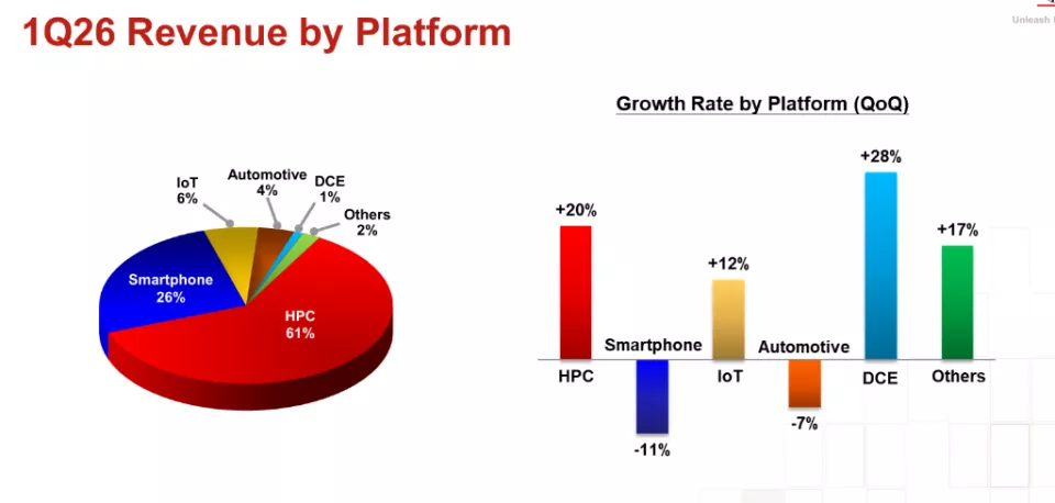 从终端应用平台拆分来看,高性能计算(HPC)平台本季度营收占比高达61%,稳居台积电第一大收入来源,较近年已呈现出明显的加速集中趋势,折射出全球云计算厂商、AI加速芯片(GPU/TPU/ASIC)持续大规模投片的行业现实。