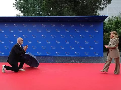 阿尔巴尼亚总理见梅洛尼,单膝跪地ZAKER