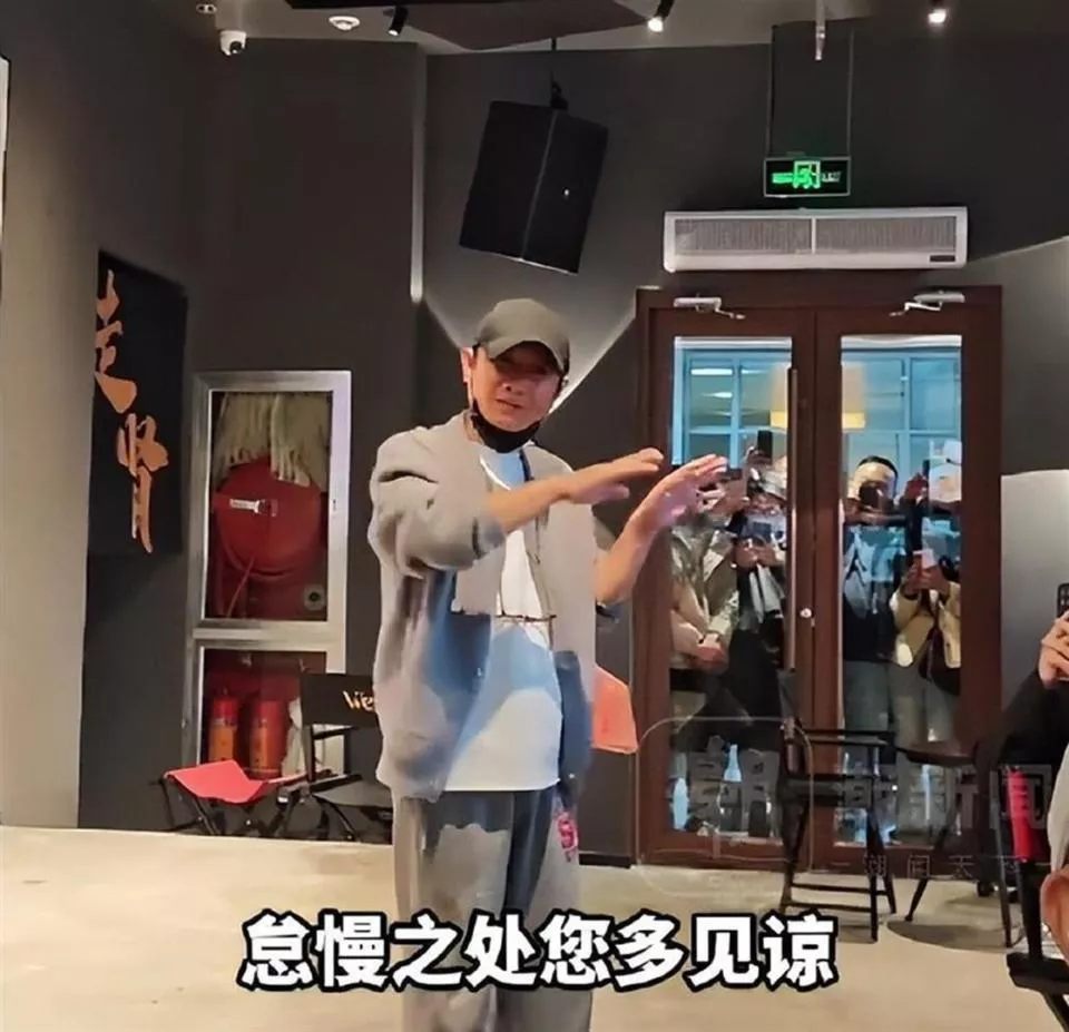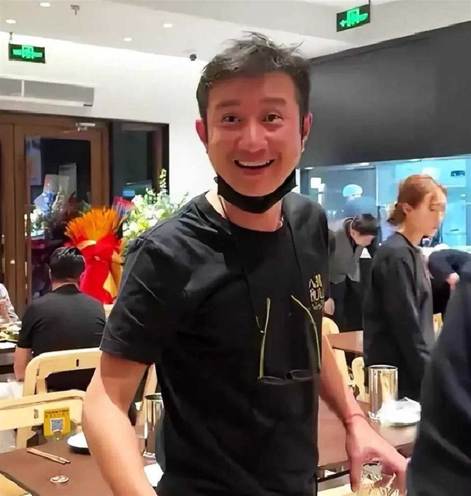 他穿着一件印着店名的黑色工服,在店里端盘子、擦桌子、跟客人合影,脸上一直挂着笑,一点明星架子都没有。