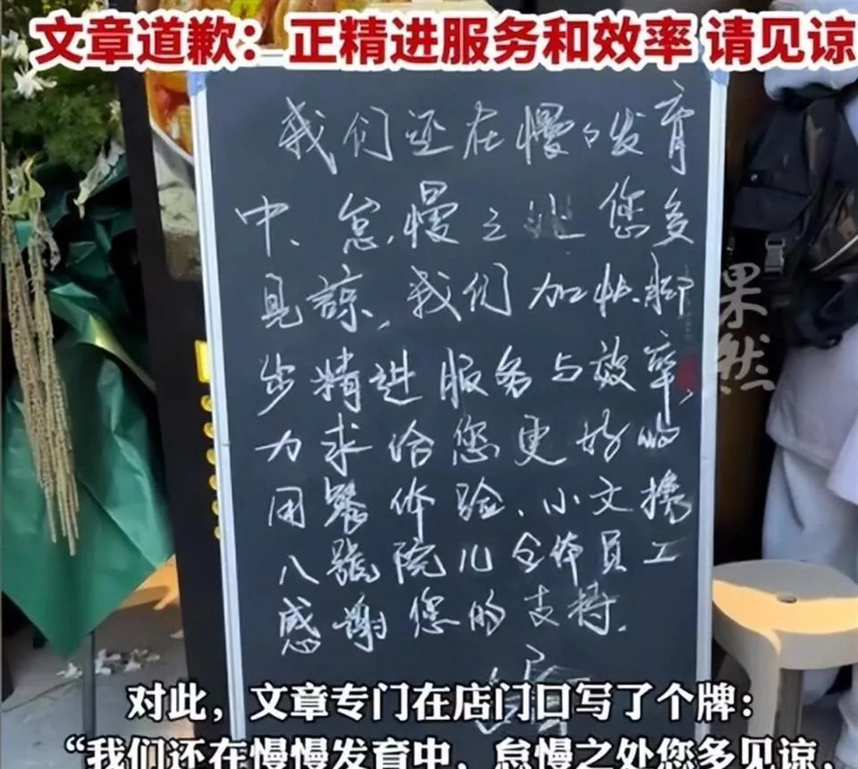 他在店门口放置了一块手写的道歉牌,上面写道:“我们还在慢慢发育中,怠慢之处您多见谅,我们加快脚步精进服务与效率,力求给您更好的用餐体验。