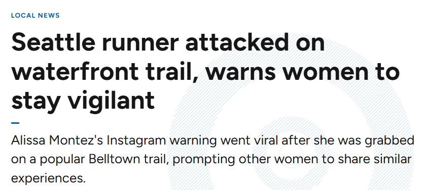 据4月16日报道,西雅图一名女性表示,周三上午,在奥林匹克雕塑公园附近一条受欢迎的跑道上,她被一名男子抓住,并差点被拉下跑道,她随后通过社交媒体向其他女性发出了警告,并引发了大量点击和转发。