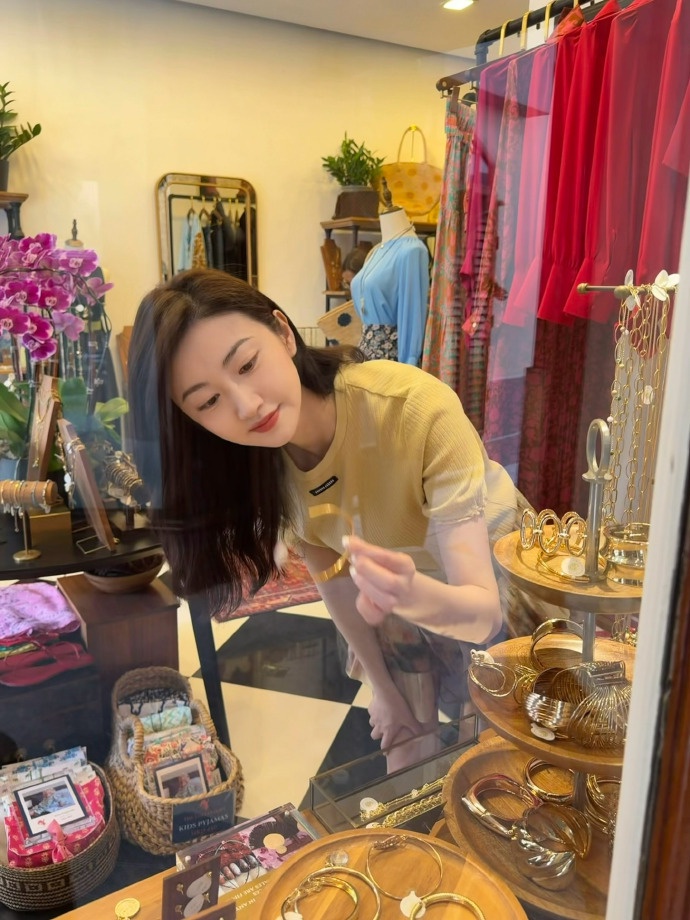她缓步走在街道上,身姿挺拔,步伐轻盈,神情悠然,仿佛在享受城市漫游的自在时光。景甜俯身挑选饰品,眼神专注,神情认真,温柔的姿态里透着几分精致女孩的仪式感。她侧身站立,身姿挺拔,鹅黄色的穿搭在复古建筑背景的映衬下格外亮眼,神情淡然,尽显松弛之美。