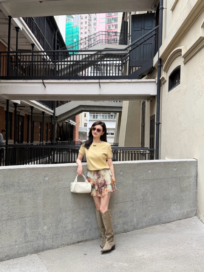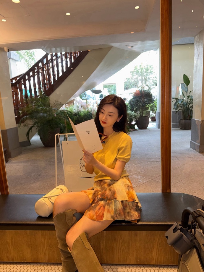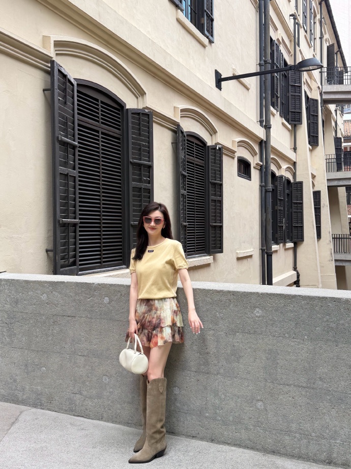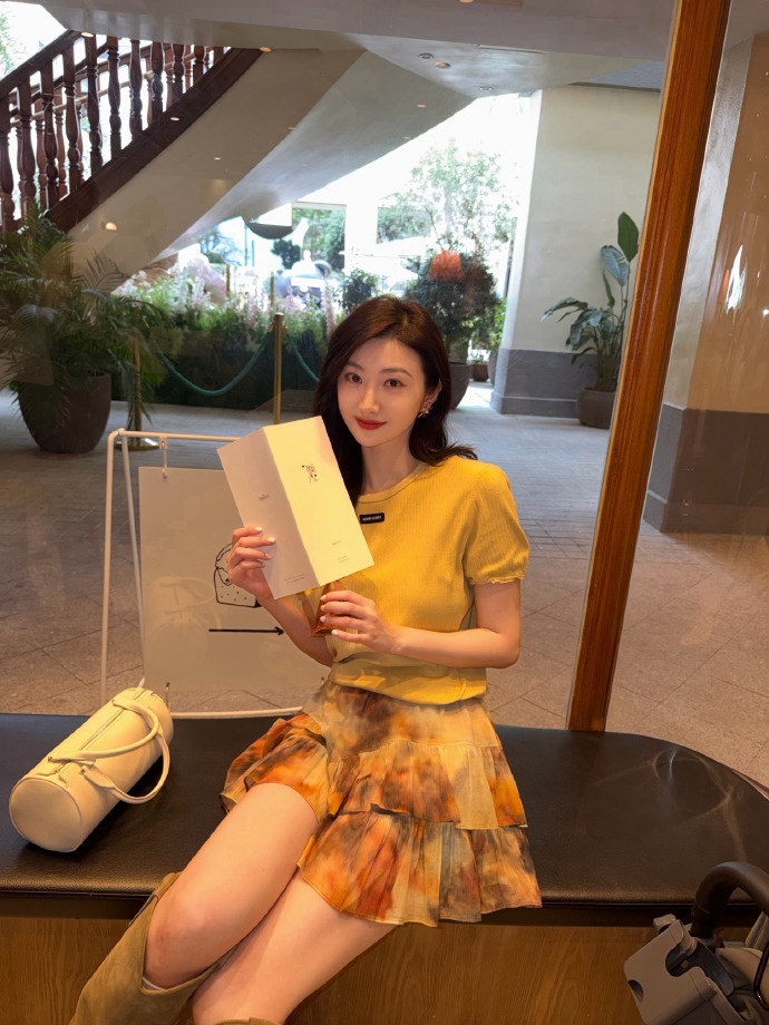 画面中的她穿着鹅黄色针织衫软糯亲肤,贴合身形却不紧绷,衬得她肤色愈发白皙透亮;碎花半裙以暖棕与鹅黄交织,裙摆轻盈飘逸,弱化了针织衫的柔和感,增添了几分少女的灵动。纤细的腰肢、匀称的四肢,每一处都透着自律带来的优越线条,碎花半裙的收腰设计更是凸显了她的身材比例,甜而不腻,美而不艳。