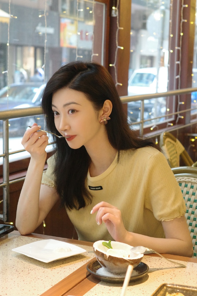 景甜坐在长椅上,双腿交叠,手持书本,神情恬静,仿佛沉浸在自己的小世界里,温柔又治愈。她手持甜品碗,眉眼弯弯,笑容灿烂,动作自然松弛,满是被美食治愈的幸福感。手持书本,坐姿优雅,眼神柔和,背景的绿意与暖黄穿搭相衬,透着岁月静好的温柔。