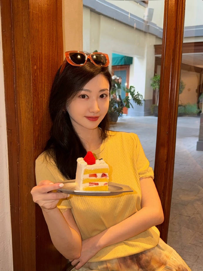 她手持草莓蛋糕,眉眼弯弯,嘴角噙着浅笑,指尖轻扶蛋糕盘,动作温柔又娇俏,满是吃到甜品的幸福感。景甜侧身坐在窗边,指尖轻抵嘴角,眼神专注地望向镜头,神情带着几分俏皮,仿佛在与镜头互动,灵动又可爱。