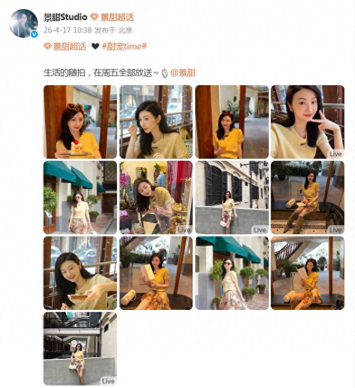 4月17日上午,景甜工作室也在社交平台上分享了一组美照,并为此配文:“生活的随拍,在周五全部放送~”。以暖黄调穿搭串联起一场松弛又鲜活的城市漫游,从颜值状态到穿搭巧思,再到镜头下的一颦一笑,都尽显她38岁依旧灵动娇俏的魅力,将 “甜宠 time” 的氛围感拉满。