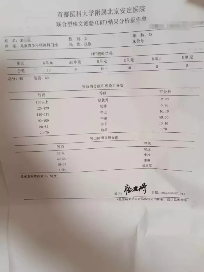 对于这一检测结果,小宋在社交平台上回应称,“做智力测试时,因为题目量很大,诊室环境嘈杂,加上我本身注意力很难集中,很多题目都是乱填,没认真做答,最终出来的69分只是一个受状态影响的参考值,并不是最终诊断。接诊的医生也明确跟我说,这个结果不能代表我的真实智力水平,更不能直接判定为智力障碍。”