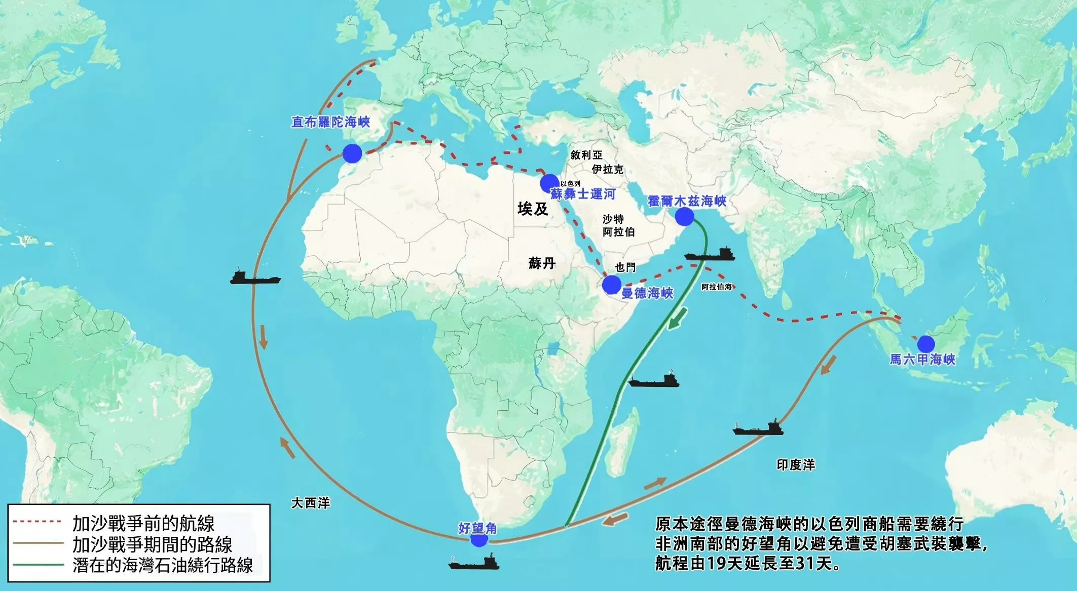由于胡塞武装的袭击,前往以色列的商船不得不从非洲南部的好望角绕行,大大增加了航运的时间与成本。(制图:Jaeger)
