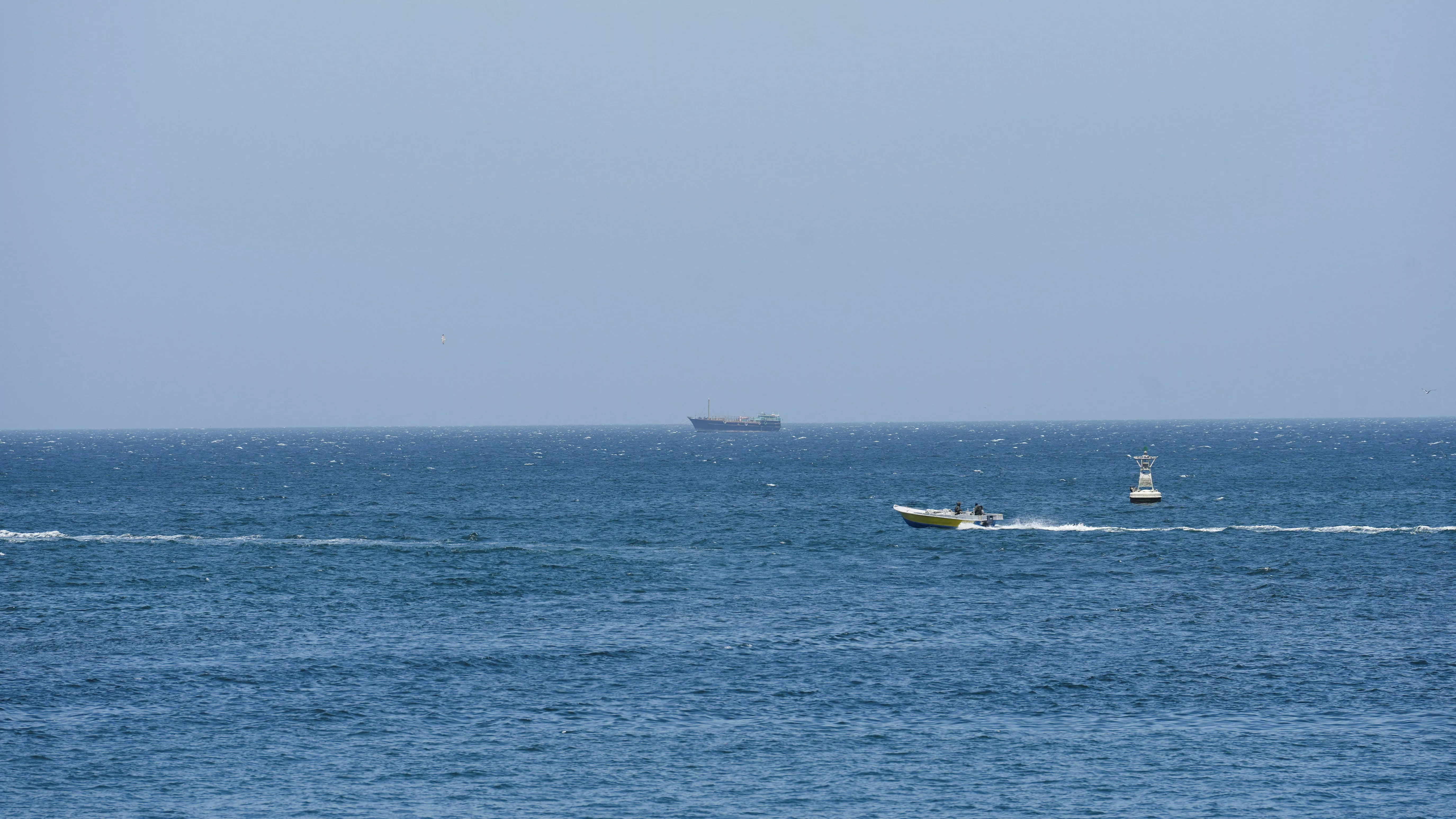 2026年4月8日,阿曼穆桑达姆省沿海,霍尔木兹海峡对岸,船只往来穿梭。 (Reuters)