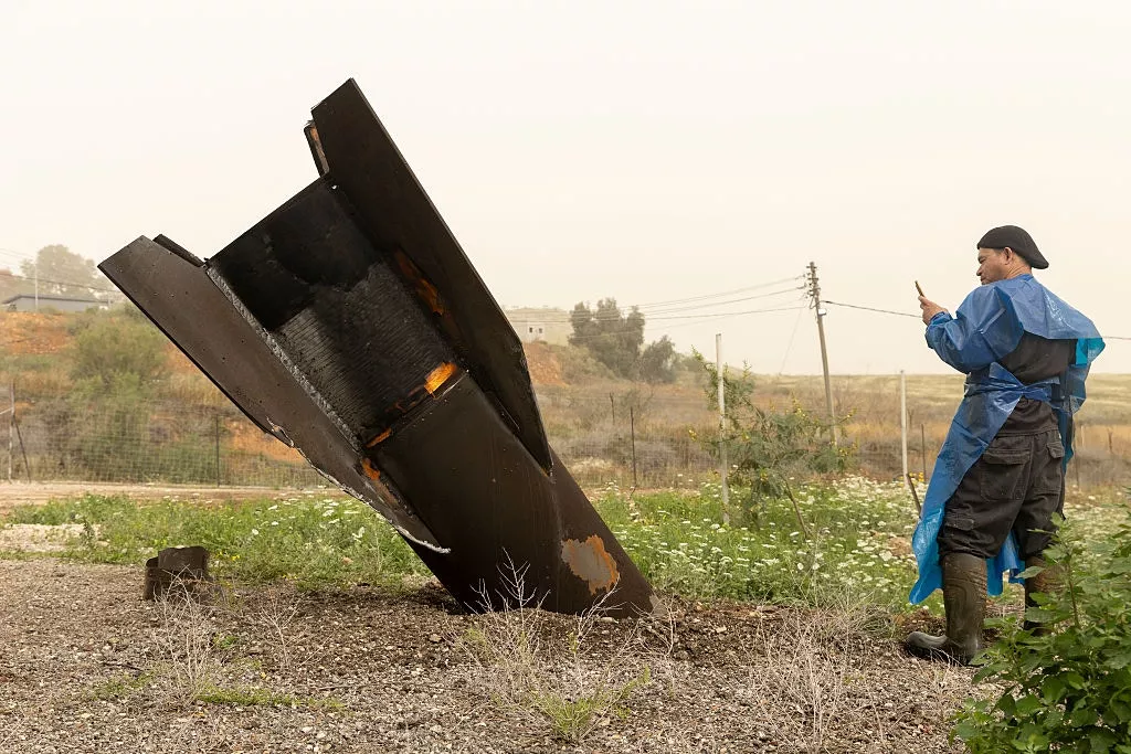 2026年4月3日,约旦河西岸约旦河谷,一名外国工人在约旦河谷北部一个犹太人定居点附近的牛棚旁,拍摄一枚伊朗弹道导弹的尾部。(Getty)