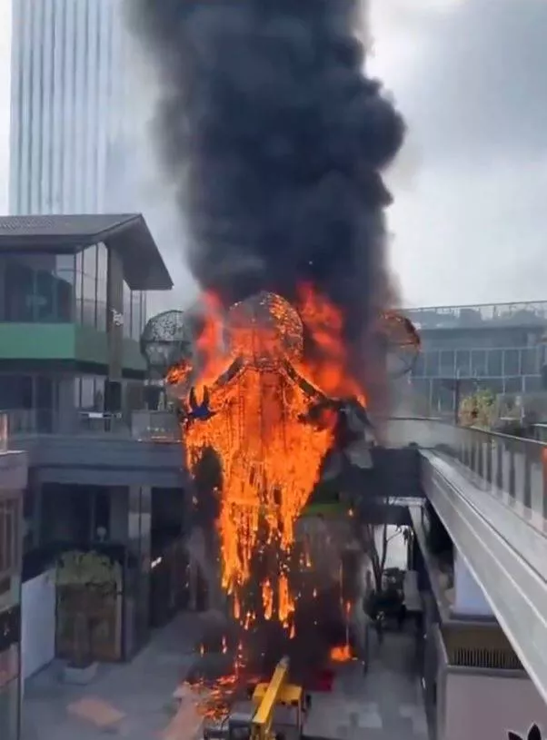 江苏苏州市1处商业区悬挂的艺术装置15日大火。(图撷取自新京报)