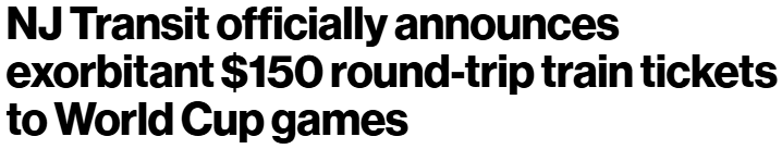 此前的报道称,从纽约前往新泽西观看世界杯比赛的往返车票价格可能高达150美元,这比最初提出的价格上涨了50美元。
