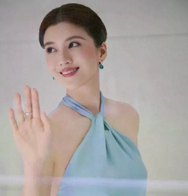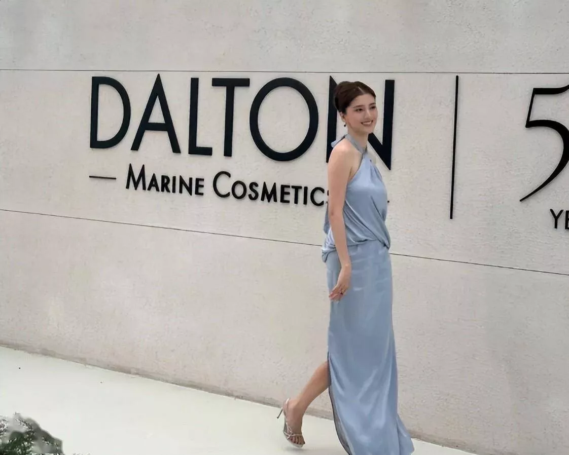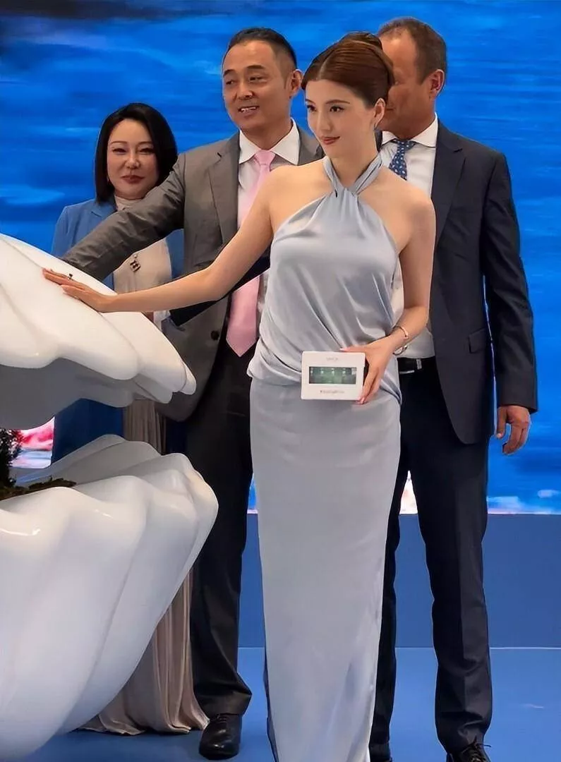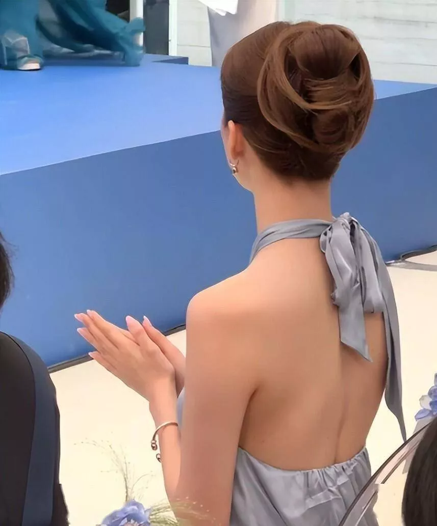 那天她穿了一身雾霾蓝挂脖绸缎长裙,浅金色的头发利落盘起,露出纤细的肩颈线条。绸缎面料自带细腻光泽,贴肤却不紧绷,完美勾勒出她170公分的身形。她在红毯上站得笔直,与人合影时微笑从容,稳稳占据着活动现场的C位。