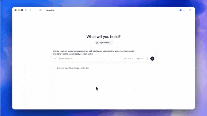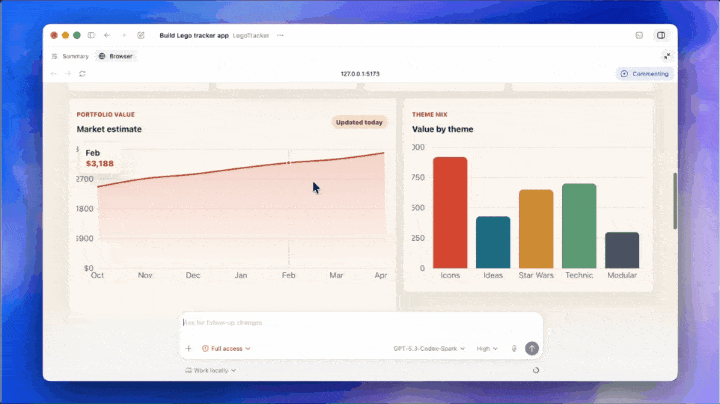 Codex从零开始写完代码、配好环境、启动本地服务器,然后在内置浏览器里打开了渲染好的页面。整个过程就几秒钟。