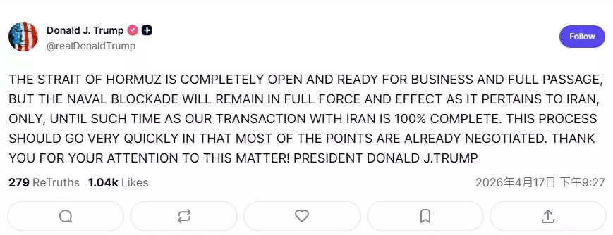 川普宣布霍尔木兹海峡全面开放。图/truthsocial@Donald J. Trump