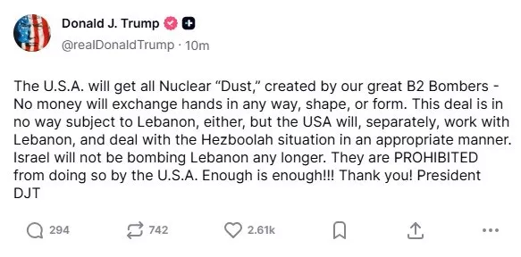 川普在帖文写道,“以色列将不会再轰炸黎巴嫩,美国已禁止(PROHIBITED)其采取这类行动,够了!!!”(Enough is enough!!!)