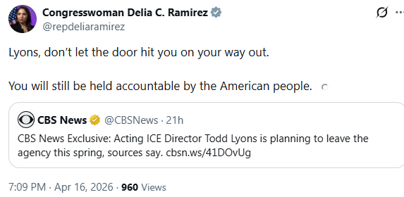 伊利诺伊州民主党众议员德莉娅·拉米雷斯(Delia Ramirez)周四晚间对莱昂斯离职的消息表示欢迎。