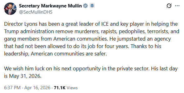 “莱昂斯局长一直是ICE出色的领导者,也是协助川普政府将杀人犯、强奸犯、恋童癖、恐怖分子和帮派成员驱逐出美国社区的关键人物。”穆林写道。
