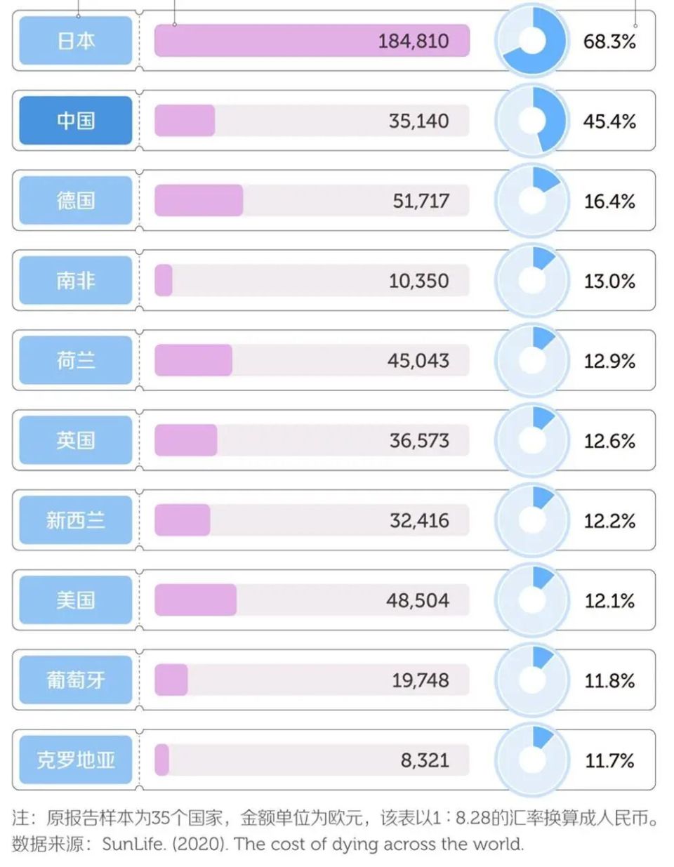 据英国人寿保险机构SunLife 2020年调查显示:中国平均殡葬费用约占年平均工资的45.4%,仅次于日本的68%,位居全球第二。