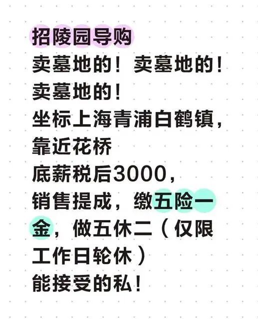元旦过后,作为部门负责人,她发了一则招聘启事:招陵园导购,底薪税后3000,加销售提成,缴五险一金,做五休二。